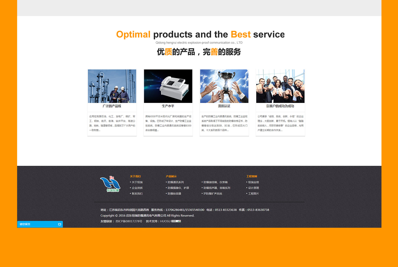 啟東恒瑞防爆通訊電氣有限公司屬研制、開發(fā)、生產(chǎn)防爆工業(yè)通訊、光通訊、工業(yè)電視監(jiān)控系統(tǒng)等設(shè)備為主的高新技術(shù)產(chǎn)業(yè),目前已發(fā)展成具有一定規(guī)模和在國內(nèi)、外有一定影響力的技術(shù)型經(jīng)濟實體,公司位于長江三角洲經(jīng)濟圈——江蘇啟東市,擁有6500平方米現(xiàn)代化廠房和完整的生產(chǎn)設(shè)備、設(shè)施。
