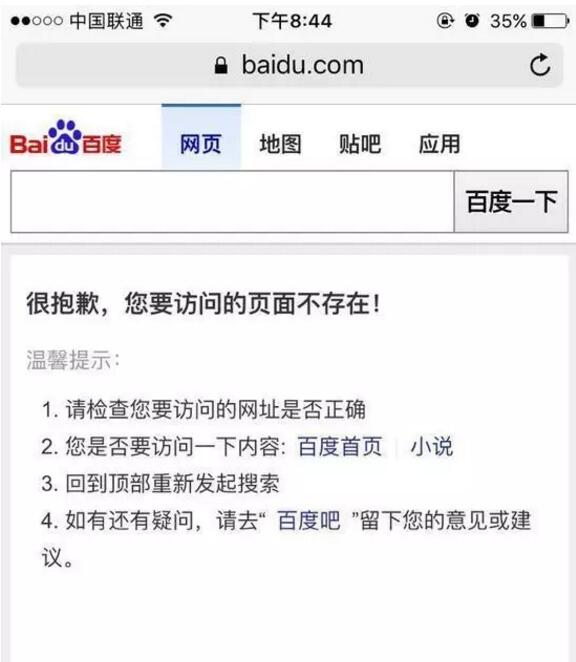28日,21點(diǎn)左右,百度移動(dòng)端出現(xiàn)故障,無(wú)論使用任何關(guān)鍵詞進(jìn)行搜索,都會(huì)提示“很抱歉,您要訪問的頁(yè)面不存在!